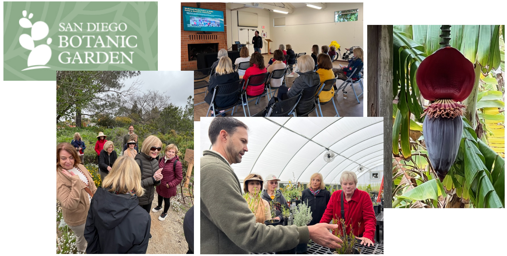 Kudos to Elizabeth Taft for organizing a delightful field trip to the San Diego Botanic Garden in Encinitas! Members first heard presentations from three of their lead scientists: CEO Ari Novy, PhD; Director of Medicinal Plants Research, Ben Naman, PhD; and Senior Director of Science and Conservation, Colin Khoury, PhD, followed by a walking tour of the gardens. Afterward, several members gathered for a delicious lunch of pot pies, hand pies and salads at Elizabethan Desserts & The 50’s Cafe.