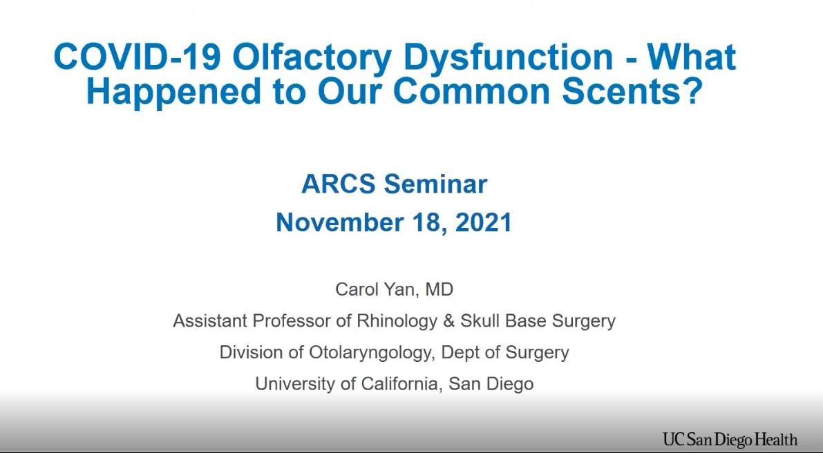 One of the many mysteries surrounding COVID-19 is the peculiar side effect of patients losing their sense of taste and smell. In the medical field, it’s called anosmia. A less publicized side effect that follows many COVID-19 patients is parosmia which is when scents and flavors become distorted, e.g., lemons may taste like sewage! There's been relatively little research into anosmia and parosmia, which until the recent pandemic have been exceptionally rare. That's left the thousands of patients experiencing these symptoms feeling confused, isolated and hopeless. To learn more about what’s being done for sufferers and what they can do for themselves, ARCS San Diego is thrilled to invite you to a special virtual “field trip” to UC San Diego on Thursday, Nov 18 from 10:30 - 11:45am Pacific where Dr. Carol Yan, a physician and researcher at UC San Diego, and Julie Carty, one of her patients, tell the story.