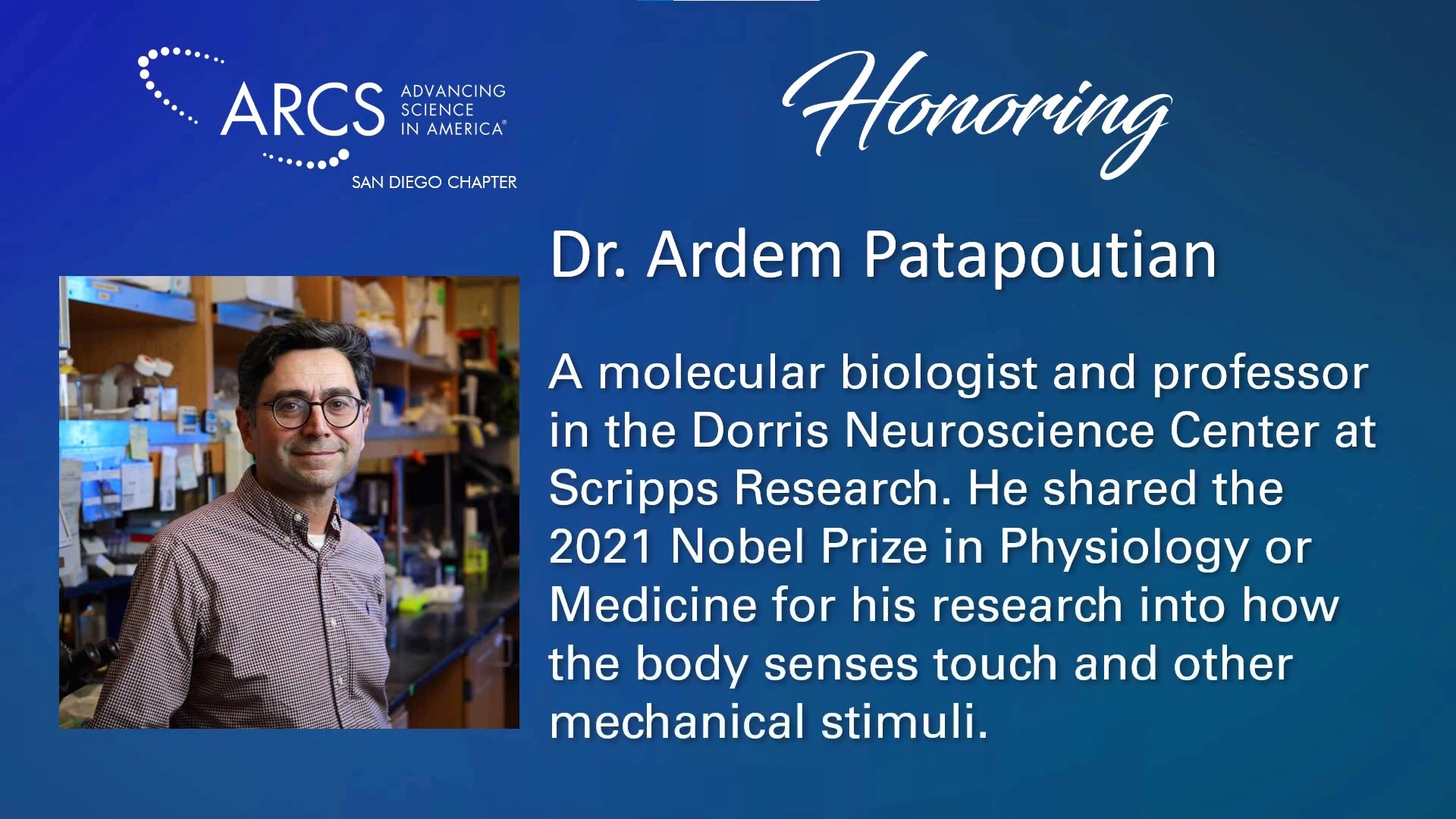 Our third virtual gala event spotlights our esteemed Scientist of the Year, Dr. Ardem Patapoutian, while highlighting our Scholars, Scholar Alumni and wonderful sponsors. If you missed the live stream or would like to see it again, please visit the Event Landing Page to watch the recorded event and view the program material.